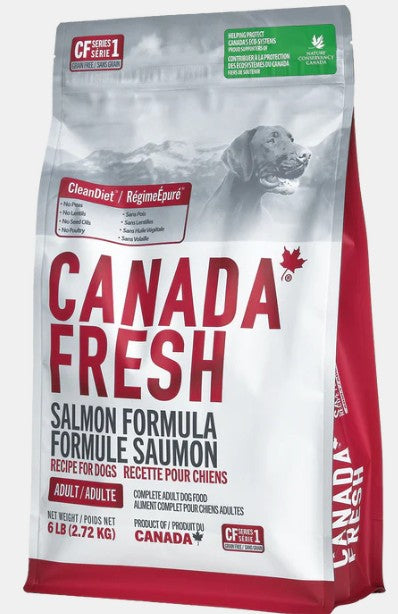 Canada Fresh Salmon Adult Dog Food uses high amounts of fresh animal based proteins (salmon), to start, and then follow that up with quality dry animal proteins, sweet potato, and simple fruits and vegetables. The diets are simple and focussed on the quality of the ingredients, not the number of ingredients.