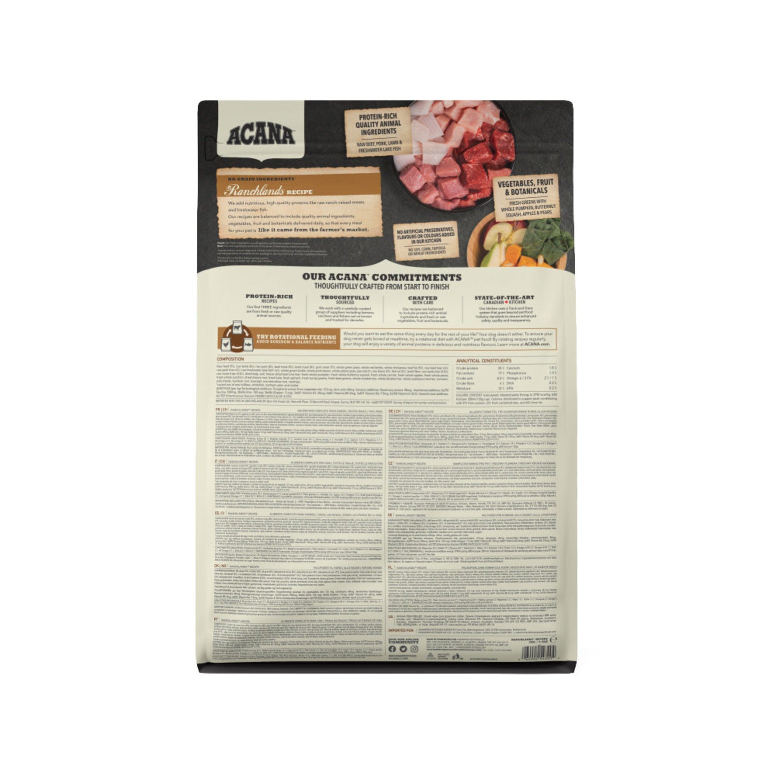 ACANA Ranchlands Dog is formulated to meet the nutritional levels established by FEDIAF for All Life Stages, except for growth of large size dogs. Store in a cool, dry place. Not fit for human consumption. | Metabolizable Energy is 3790 kcal/kg (455 kcal per 250ml/120g cup), with 37% from protein, 23% from carbohydrates, and 40% from fat.