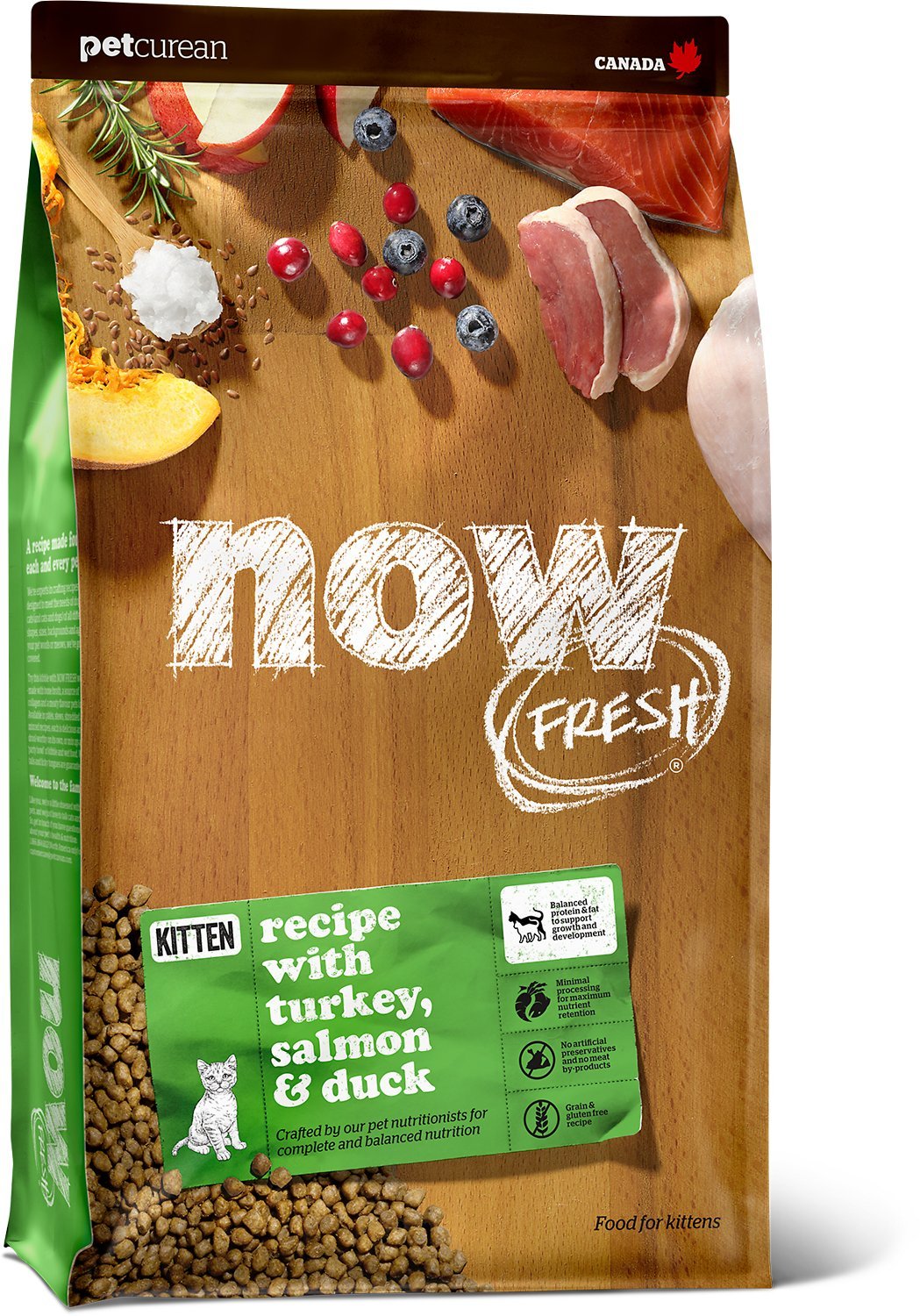 NOW FRESH Grain Free Kitten Recipe Cat Food is made with 100% FRESH turkey, salmon, duck and Omega 3 & 6 oils from coconuts and canola.